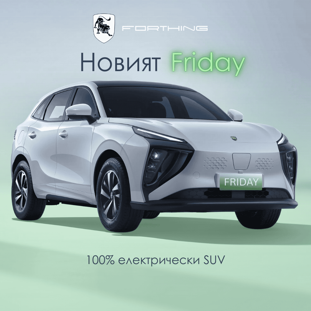Forthing Friday е електрически SUV, който се позиционира като модерен и функционален представител на градските и междуградски електромобили със сериозни технически възможности. Комбинирайки динамичен дизайн и впечатляваща технологична интеграция, Friday отговаря на нуждите на потребителите, които търсят комфортен, мощен и адаптивен електрически автомобил за ежедневна употреба и по-дълги преходи. Автомобилът разполага с постоянно магнитен синхронен електрически мотор с пикова мощност до 150 kW и въртящ момент 340 Nm, който гарантира уверено ускорение и отзивчиво шофиране. Моделът предлага два варианта на батерия – 63 kWh или 85.9 kWh с пробег, който може да надхвърли 600 км по CLTC, в зависимост от избраната конфигурация. Forthing Friday не се ограничава само до силова част: моделът включва интелигентни системи за подпомагане на водача, инфо-развлекателни екрани с голяма диагонал, 360° камера и съвременни асистиращи технологии, които повишават безопасността и удобството при шофиране.